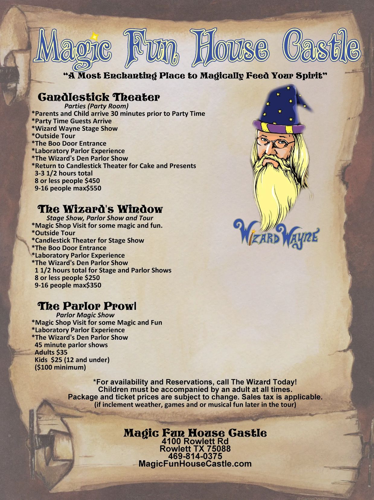 Next, to Mystify and Stimulate Your Imagination, experience the wonder of Magic and Mystery while Wizard Wayne serves Several Magic Performances in the Two Interactive Parlors for the Whole Family to Enjoy. Hear a bit of the History of Magic and the Importance some Great Magicians have brought to the world.